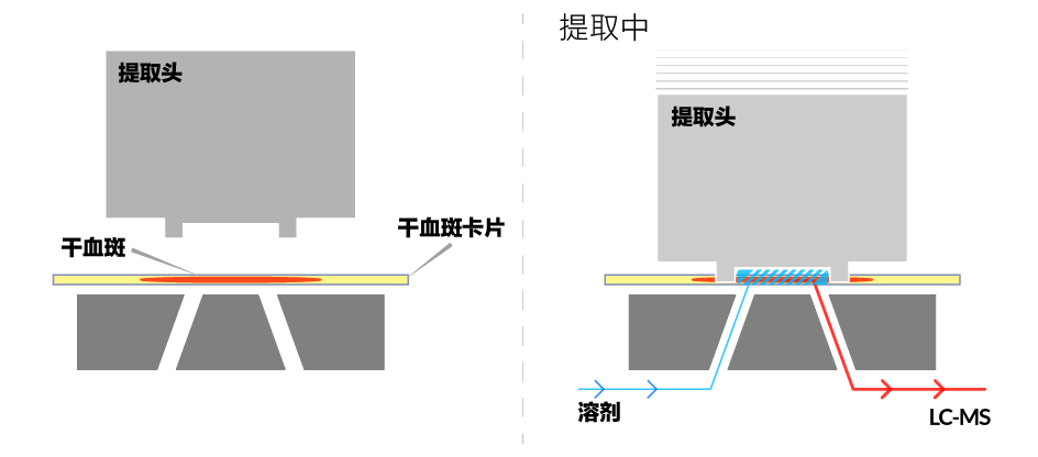 CAMAG 獨特的提取頭設(shè)計中包含一個密封環(huán),它能緊緊地壓在干血斑卡上,確保溶劑只在限制范圍內(nèi)進行提取。同時,溶劑從卡片的底部進入,可以減少基質(zhì)污染物的提取 (見圖 1)。采用這種設(shè)計,需要提取的溶劑量只是傳統(tǒng)提取方法的十分之一,因此得到更濃縮的樣品,這將進一步提高分析結(jié)果的可靠性。此外,用戶還可以根據(jù)所感興趣的分析物而設(shè)定不同的提取參數(shù) (如溶劑混合的比例、流速和溶劑體積)。