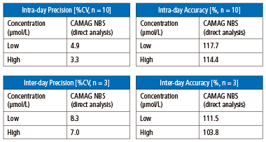 為了測試 CAMAG DBS-MS 500 在線提取系統(tǒng)的性能,相關(guān)的實驗中對比了使用 CAMAG 在線提取和常規(guī)提取方法來處理苯丙酮尿癥 (PKU) 患者的樣本得到的質(zhì)譜圖,見圖 2(a)。這兩種方法可比性高,相關(guān)性非常好,R2?為 0.994,見圖 2(b)。批內(nèi)和批間檢測精度均在 10% 以下,見圖 2(c)。測試其他疾病 (中鏈酰基輔酶 A 脫氫酶缺乏癥 (MCAD)、丙酸血癥 (PA) 和楓糖漿尿癥 (楓糖尿癥) 等的結(jié)果可以在參考文章中找到。