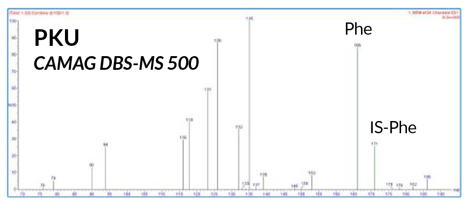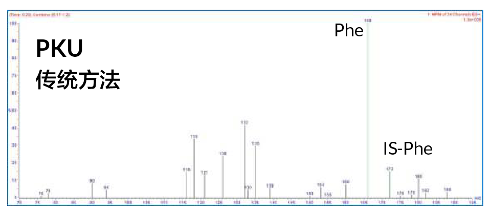 圖2(a) PKU 患者干血斑分析質(zhì)譜圖(左圖為傳統(tǒng)方法結(jié)果;右圖為 CAMAG DBS-MS 500 結(jié)果)