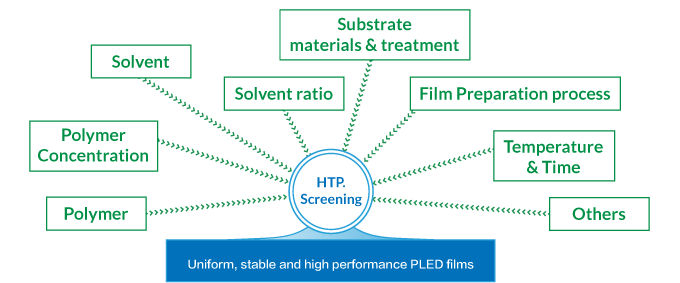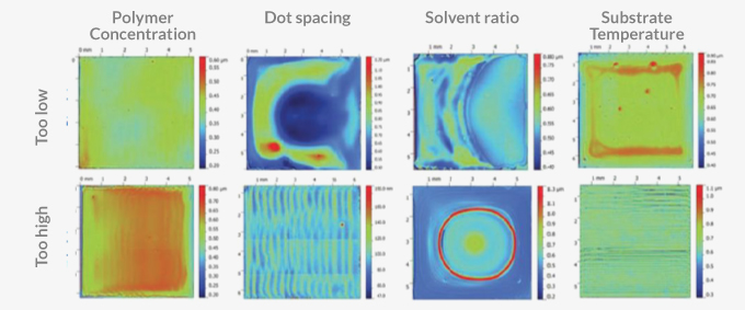 Using IJP to produce a uniform, stable and highly luminescent PLED film, it requires screening and optimization for various parameters which affect the film quality and properties [Fig. 2].