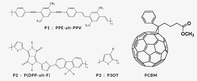 Organic photovoltaic (OPV) has been receiving increasingattention because of itslow cost, simple process, low environmental concern and the capability of manufacturing flexible battery. Currently, the blend heterojunction OPV can achieve the higher photoelectric conversion efficiency. This so-called heterojunction is simply prepared by blending electron-donor and electron-acceptor materials to form the film. To obtain high performance solar cells, optimization for the blending of raw materials is necessary to produce a film with low energy gap and wide absorption spectrum.