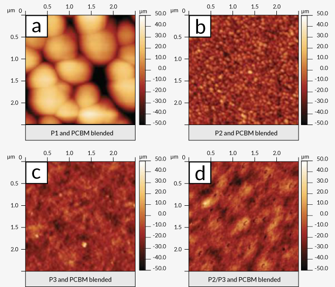 (1)As a good electron acceptor, PCBM is usually used in OPV. So first of all, it is necessary to consider the surface morphology of various conjugated polymers after blending them with PCBM. , . Formation of a rough surface from blending of P1 and PCBM by atomic force microscope (AFM) [Fig. 7] is not beneficial to electron transport. However, the respective blending of P2, P3 and P2/P3 with PCBM can form smooth and uniform films. Thus, it is important that use of conjugated polymers of P2 and P3 is preferred when mixed with PCBM.