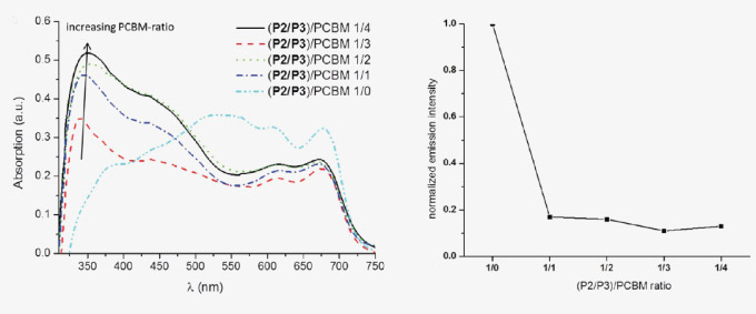 (3)After that, they blend P2/P3 with a fixed ratio of 4/6 and then blend P2/P3 with PCBM in different combination ratios. By measuring the absorption spectrum and emission intensity [indirectly implying the electron-hole recombination rate] of the films [Fig. 9], it is found that P2/P3/PCBM film with the ratio of 4/6/30 has the optimal absorption spectrum and lowest emission intensity.