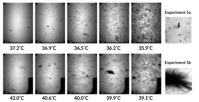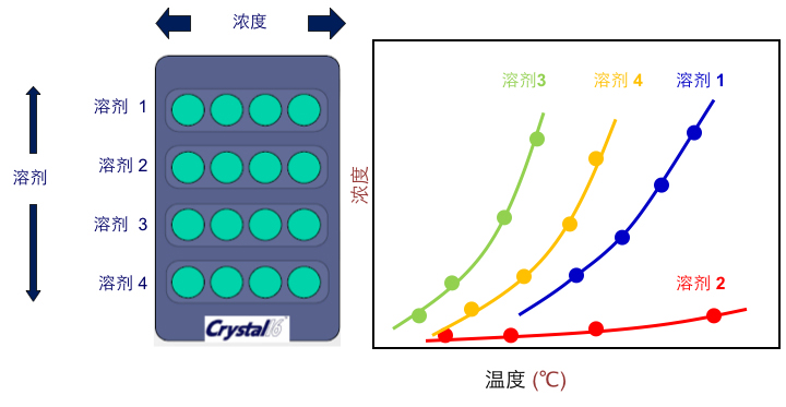 當(dāng)已篩選出合適和理想的晶體和溶劑體系后,便需要測(cè)出藥物在該體系中的溶解度曲線和介穩(wěn)區(qū)寬度 (MSZW),以便找出合適的操作范圍。溶解度曲線和 MSZW 均為結(jié)晶工藝的重要數(shù)據(jù),可以有效地指導(dǎo)生產(chǎn)過程,控制結(jié)晶溫度曲線及加入晶種的時(shí)機(jī),幫助有效控制生產(chǎn)工藝和提高產(chǎn)量。使用傳統(tǒng)重量法進(jìn)行溶解度曲線測(cè)定效率低,且難獲得 MSZW 數(shù)據(jù),但 Technobis 平行結(jié)晶儀便利用創(chuàng)新的非插入式在線濁度測(cè)定法,輔以精確的溫度和攪拌控制,簡(jiǎn)單快速完成溶解度曲線和 MSZW 測(cè)定。