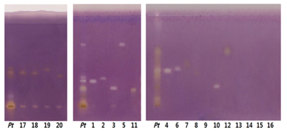 為了進一步尋找活性成分,更利用薄層色譜生物自顯影活性篩查模型,實現了對這 150 個餾分的超快速篩查,其中 15 個餾分對比陽性對照具有明顯的抑制活性。再經過細分純化工作,最終得到 20 個活性化合物。從粗提物到得到活性單體,工作周期不超過 5 個工作日!