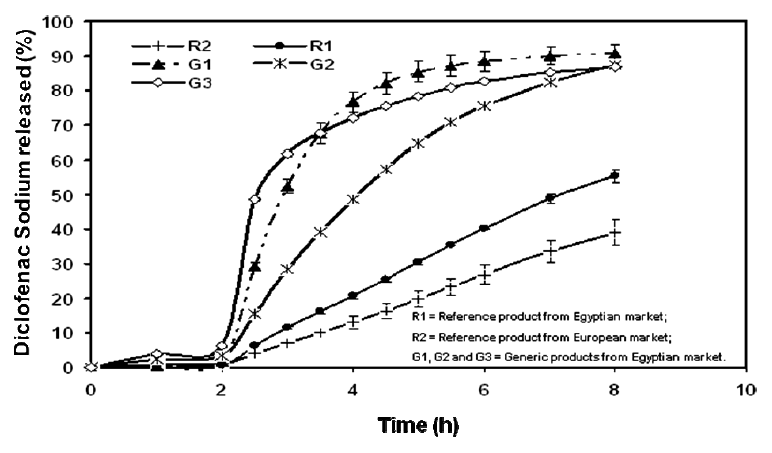Dissolution Technology曾發(fā)表一篇文獻,研究了使用流池法進行雙氯芬酸鈉緩釋片劑的溶出度篩選方法。文獻當中使用了流池法進行實驗,比較了流速和不同尺寸的流池以及載樣方式對緩釋片劑釋放度的影響,找出了雙氯芬酸鈉緩釋片最佳的釋放條件后,建立了體外釋放度測試,平行考察了諾華兩個不同產(chǎn)地生產(chǎn)的參比制劑,以及埃及本地生產(chǎn)的仿制藥,得到的溶出曲線顯示了不同產(chǎn)品的釋放結(jié)果。