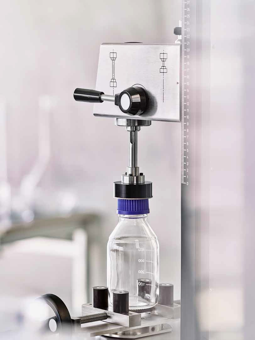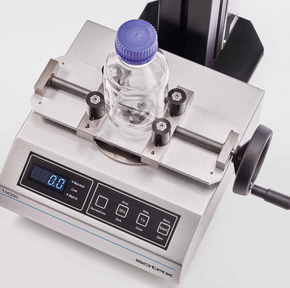 Proven torque tester for repeatable measuring of opening & closing torque of bottle caps including child-resistant closures. Custom-made cap adapters avoid undesired effects of clamping or applying additional pressure on bottle caps during measuring. A motorized drive ensures repeatability and highly accurate turning movements.