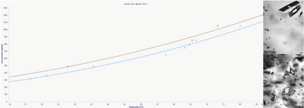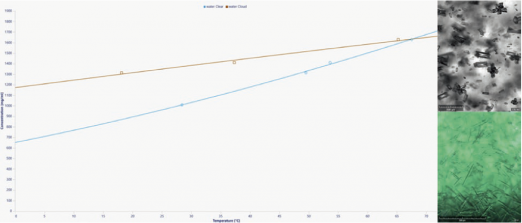 收集了六水硫酸鎳的幾個(gè)濃度清點(diǎn),并繪制了溶解度曲線。還檢測(cè)到了濁點(diǎn),但數(shù)據(jù)點(diǎn)并不匹配。通過圖像分析,我們可以觀察到兩種不同的形態(tài):針狀和金字塔狀。據(jù)觀察,不同的硫酸鎳水合物具有不同的晶體形態(tài)。研究發(fā)現(xiàn),溫度低于 31.5oC時(shí),硫酸鎳會(huì)以正交七水合物形式結(jié)晶,高于 31.5oC時(shí),則會(huì)以四水合物/六水合物形式結(jié)晶。因此,不同的結(jié)晶行為可歸因于硫酸鎳形成了不同的水合形式。