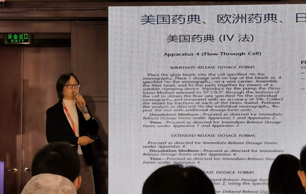 為配合主題,力揚(yáng)委派了業(yè)務(wù)發(fā)展總監(jiān)趙宇女士在現(xiàn)場分享了 [流池法溶出度測試輔助復(fù)雜制劑的開發(fā)與研究] 報(bào)告,當(dāng)中為 2020 版中國藥典新增流池法進(jìn)行解讀,介紹流池法原理及案例分析。
