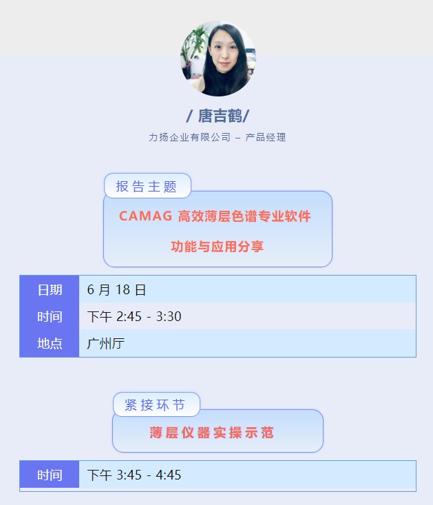 與此同時(shí),唐吉鶴女士也將在會(huì)議上發(fā)表 [CAMAG 高效薄層色譜專業(yè)軟件功能與應(yīng)用分享] 報(bào)告,闡述? CAMAG?VisionCATS?專業(yè)軟件如何發(fā)揮其強(qiáng)大功能,協(xié)助質(zhì)控人員充分利用軟件資源 (如方法數(shù)據(jù)庫(kù)) 來(lái)實(shí)現(xiàn)更高效的方法開(kāi)發(fā)和質(zhì)控。