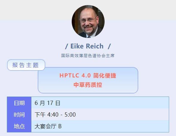 此外,會(huì)議也安排了國(guó)際高效薄層色譜協(xié)會(huì)主席兼 CAMAG 實(shí)驗(yàn)室主管 – Eike Reich 教授發(fā)表以下報(bào)告,介紹 HPTLC 如何實(shí)現(xiàn)簡(jiǎn)化且便捷的中草藥質(zhì)控。